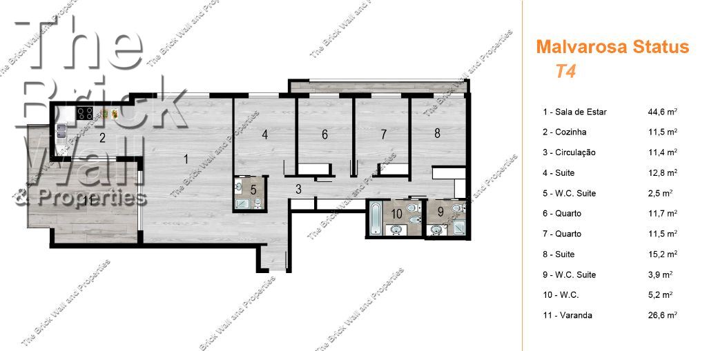 Dispõe de cozinha de 11,5 m2 totalmente equipada, sala de estar de 45 m2, dois quartos com áreas de 12 m2, uma suite de 13 m2 com casa de banho de 2,5 m2 e outra suite de 15 m2 com casa de banho de 4 m2 com base de duche, casa de banho de 5 m2 com banheira.